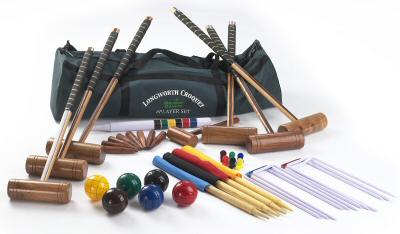 An excellent value, full-sized 6 player croquet set, with all the equipment necessary for a good game in the garden. This is probably the cheapest full-sized 6-player set available. Includes 6 full-sized natural hardwood mallets with leather-bound handles, Full-size wooden 12 oz balls, steel hoops, hoop mallet, corner flags and pegs, plastic clips, hardwood winning post and rules. Packed in a zip-fastening nylon bag with shoulder strap for portability. - Ideal Family Set