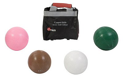 balls that Uber supply with their top-end croquet sets. Along with mallets, croquet balls are the most important part of a croquet set. Get it right, and you will be able to really feel the shot, and appreciate fully the right "knock" as one ball hits another. The important thing to look for in a croquet ball is that it is of regulation size and weight (a regulation croquet ball must be 3 5/8" diameter, and weigh 16 ounces), as a ball that is too light or too small will not behave in the way it should do. Finding regulation size & weight balls is actually not as easy as you might think, and if you do find them, they are usually quite highly priced - until now that is. Our replacement balls are made from a tough composite material and will provide years of good service. We offer so-called primary colours (Red, Blue, Black & yellow), as well as the secondary colours (Pink, Brown, White & Green). We sell individual balls, or as sets of primary or secondary colours. - Ideal Replacement regulation size & weight